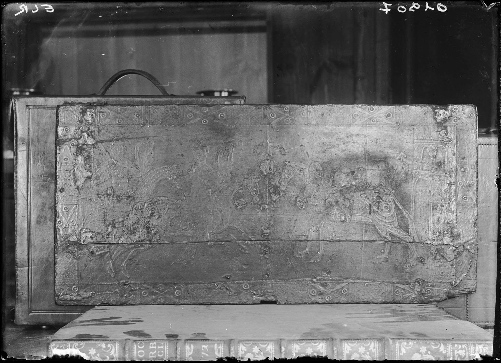 POP | Plateforme ouverte du patrimoineCoffret de mariage en bois peint devenu coffret reliquaire. Vue du couvercle : chevaliers