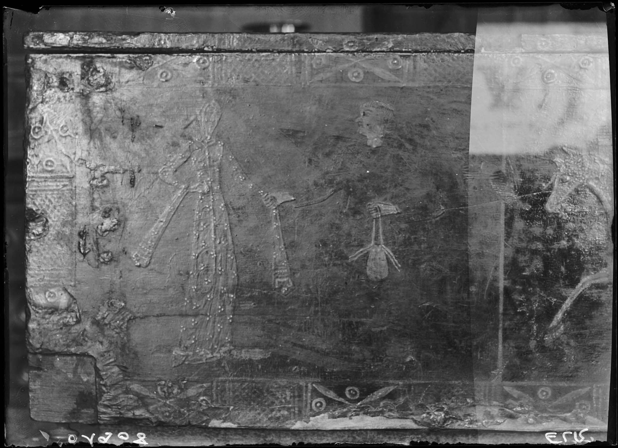 POP | Plateforme ouverte du patrimoineCoffret de mariage en bois peint devenu coffret reliquaire. Vue de détail d'un grand côté : un homme et une femme