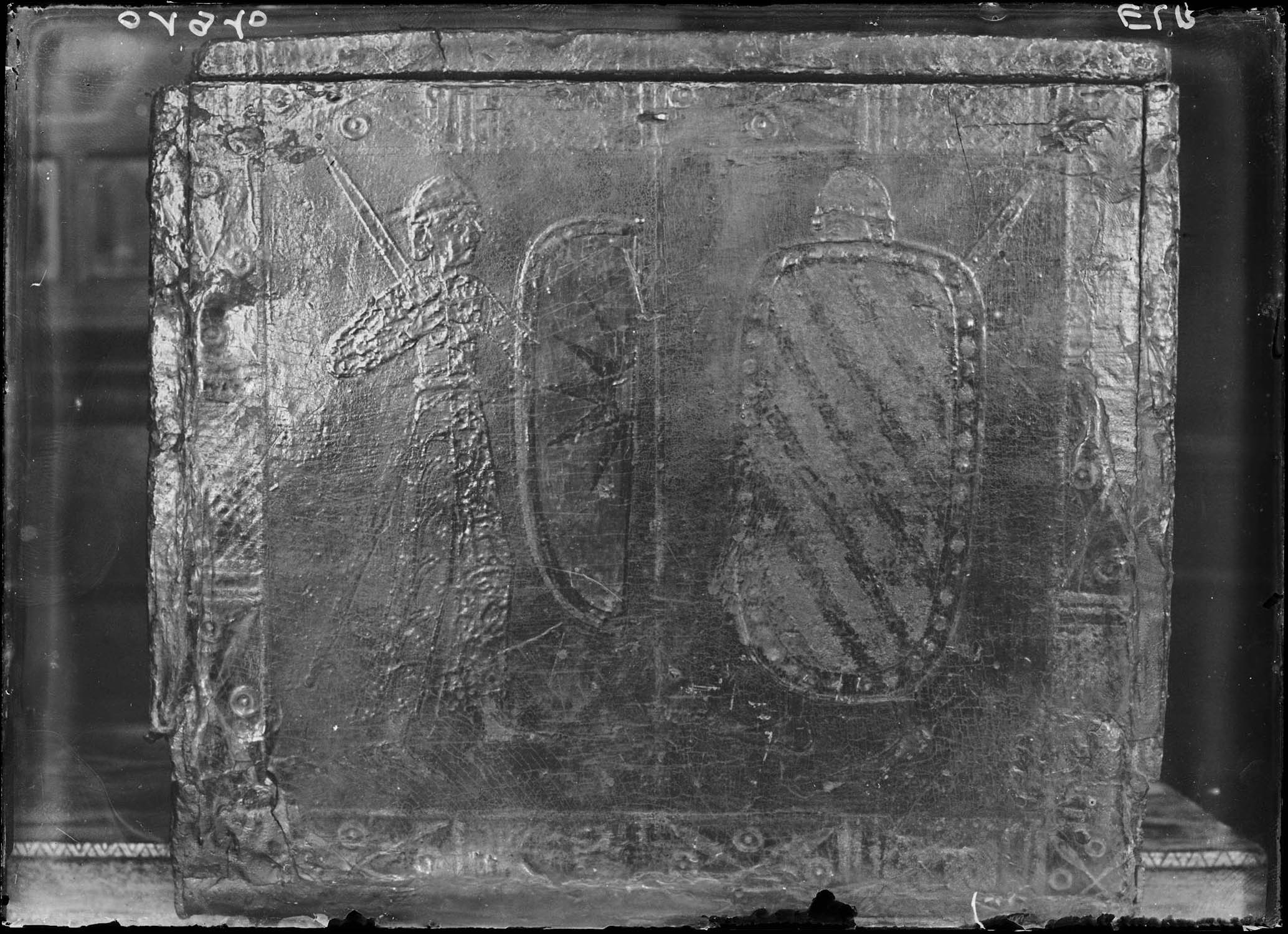 POP | Plateforme ouverte du patrimoineCoffret de mariage en bois peint devenu coffret reliquaire. Vue d'un côté latéral : chevaliers s'affrontant