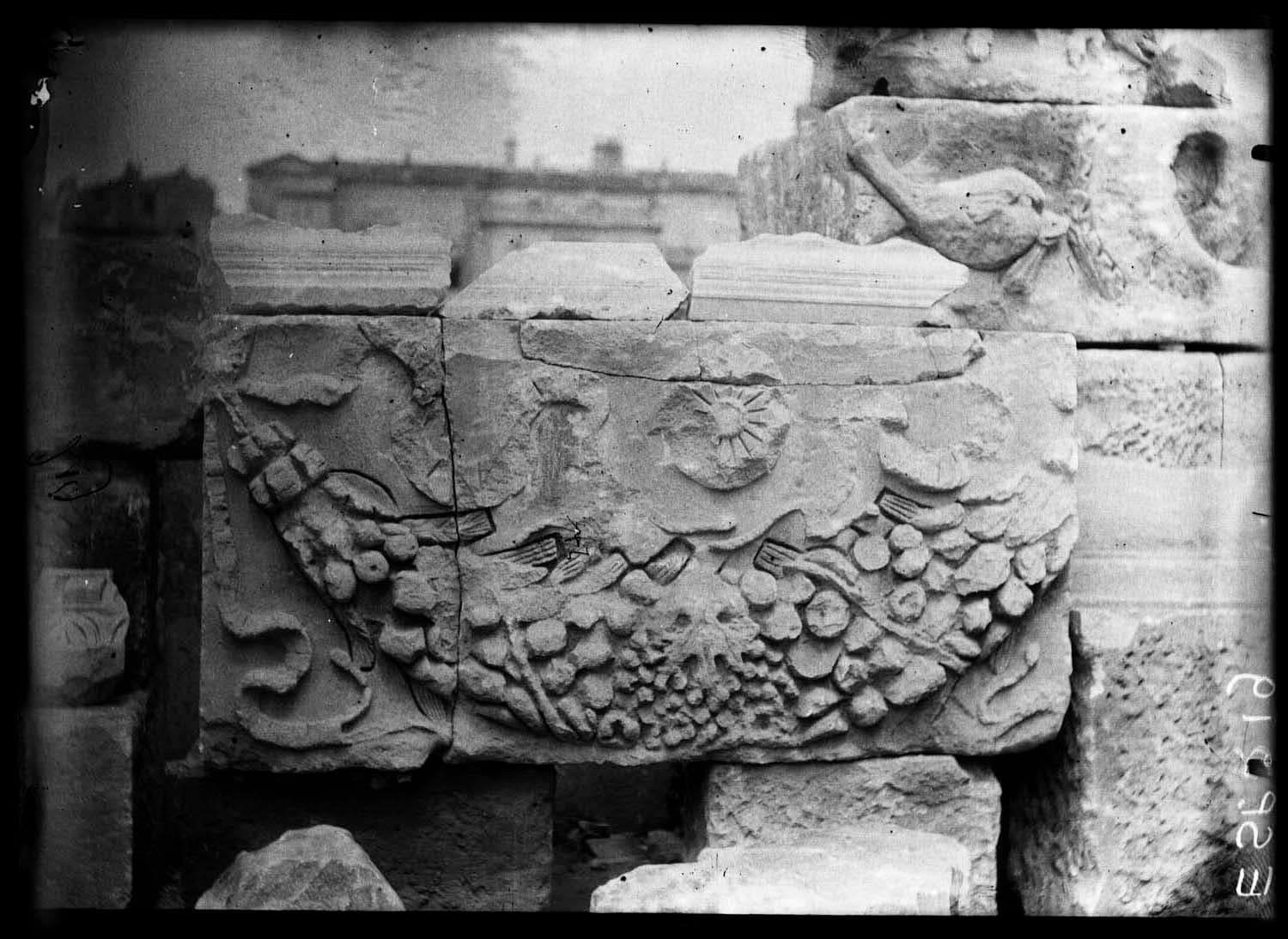 Frise avec guirlande de fruits, nèfles, raisins et épis de blé, aux extrémités retenues par des bandelettes flottantes ; Rosace au-dessus de la guirlande