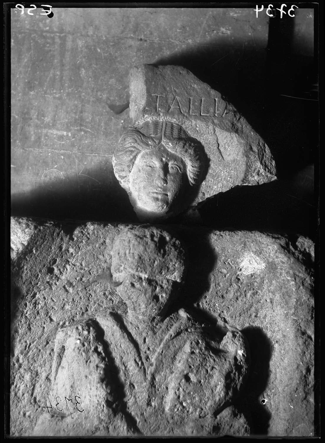 En haut : fragment de stèle avec, dans une niche, tête de femme ; Au-dessus, l'inscription …tallia…