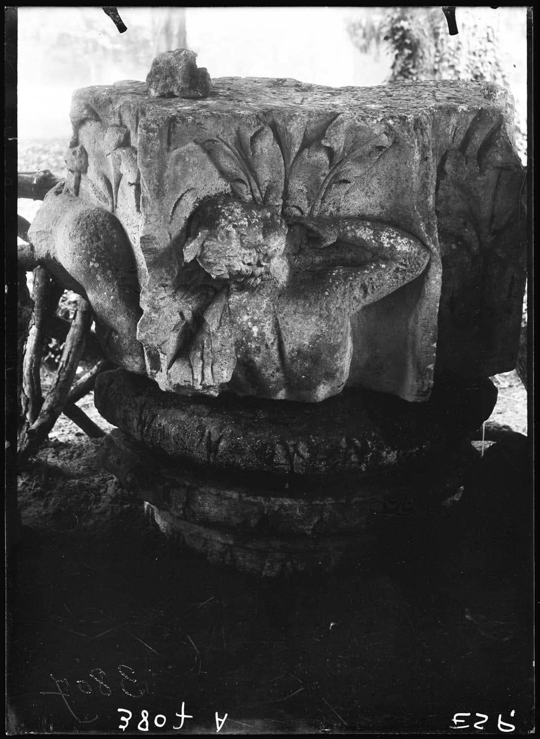 Bloc polygonal avec Mercure, vu de dos, la tête levée et tenant un caducée ; Il est coiffé de deux ailerons et porte un manteau sur l'épaule gauche [sujet de cette photographie] ; À droite, en retrait, décor de plantes stylisées ; À gauche, épaule et bras gauches d'un personnage nu, paré de deux bracelets ; Chaque figure est accompagnée de feuilles stylisées ; Il s'agit sans doute d'une pierre provenant d'un pilastre d'angle