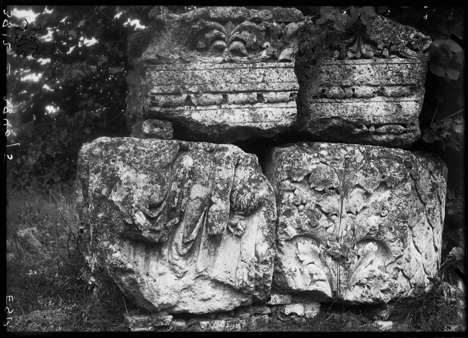 Deux blocs superposables avec Mars imberbe, au repos, le pied gauche sur un gradin, coiffé d'un casque, les épaules couvertes d'un manteau flottant ; À gauche, bande de feuilles stylisées ; À droite, en retour oblique, femme nue, Niobide ou Polyxène, à demi renversée sur les genoux d'un personnage assis et drapé, et autres feuilles stylisées ; Sans doute, restes d'un pilastre d'angle