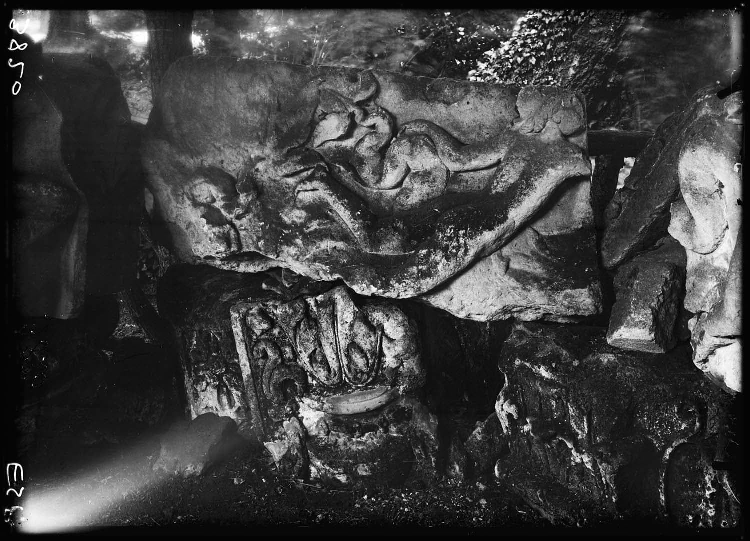 Bloc avec Néréide et monstres marins ; La Néréide, complètement nue, nage vers la droite et s'appuie de la main gauche, sur la queue de l'un des monstres