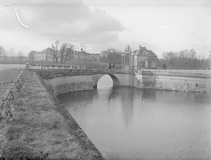 POP | Plateforme ouverte du patrimoineDouve du château, grille, pavillon d'entrée, Grandes-Ecuries à l'arrière-plan