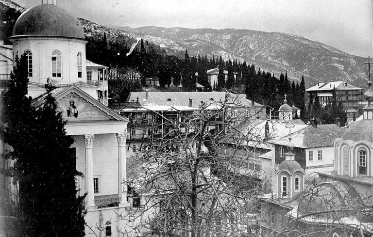 monastère ; cour ; chapelle ; arbre ; coupole ; colonne ; neige ; montagne