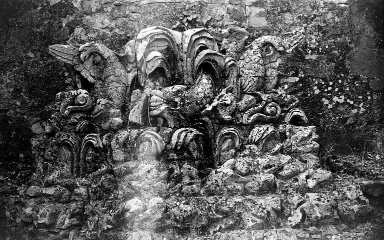 Décor architectural sculpté d'un bassin, ornement végétal habité d'animaux : poisson, oiseau