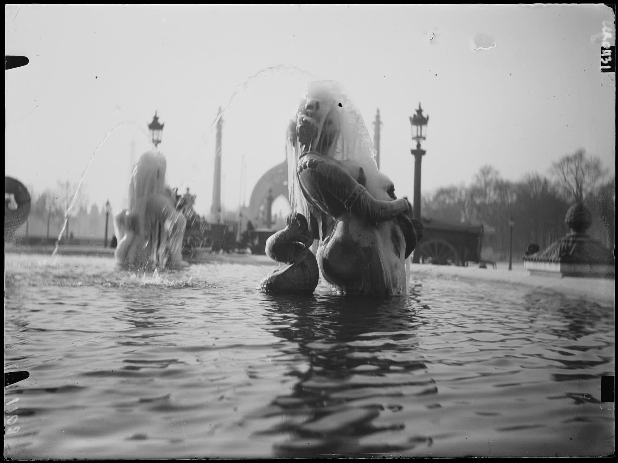 POP | Plateforme ouverte du patrimoineFontaines de la place de la Concorde : face à droite. A l'arrière-plan, entrée de l'Exposition Universelle. Détail d'une statue de la fontaine sous la glace