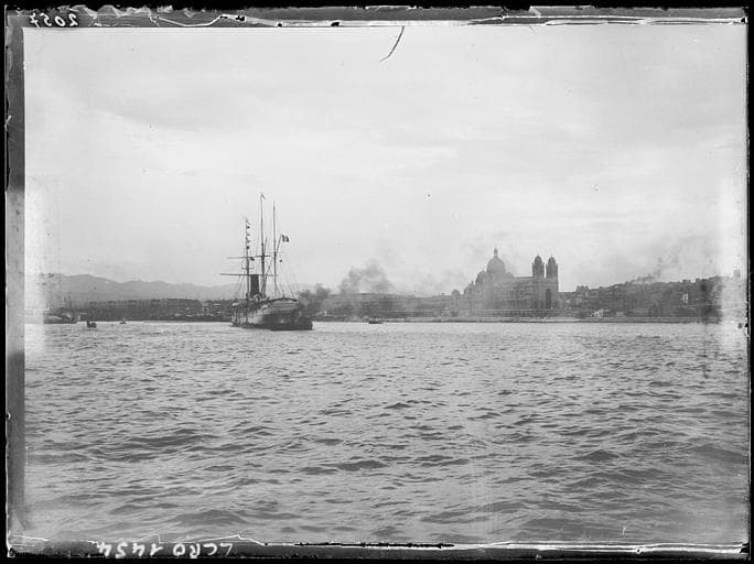 Vue du bateau le Saint-Mandrier sur le bateau arrivant de Chine. Cathédrale et port
