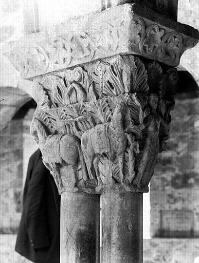 Cloître, galerie ouest, chapiteau : décor feuillagé et chevaux
