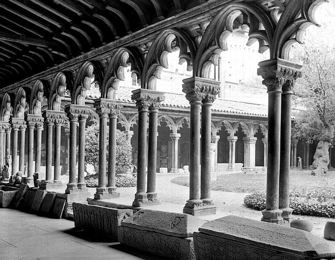 POP | Plateforme ouverte du patrimoineGrand cloître, vue prise de la galerie ouest, sur angle nord-ouest : série de sarcophages en pierre