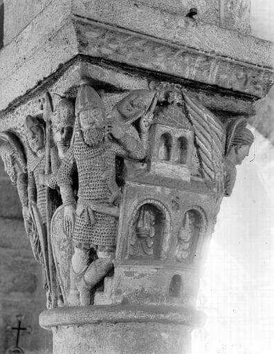 Intérieur, hémicycle du choeur, chapiteau : Soldats gardant le tombeau