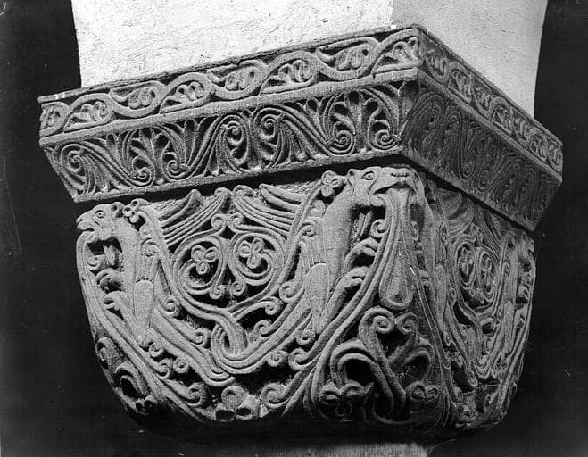 POP | Plateforme ouverte du patrimoineIntérieur, chapelle haute du chevet, chapiteau de la nef : animaux dans des entrelacs feuillagés