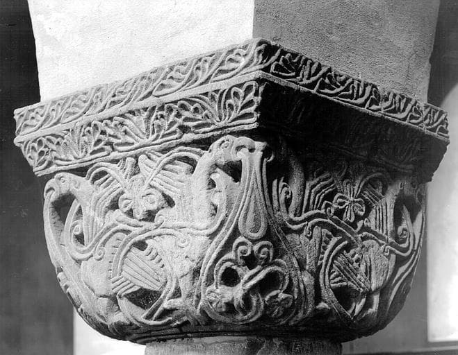 POP | Plateforme ouverte du patrimoineIntérieur, chapelle haute du chevet, chapiteau de la nef : animaux dans des entrelacs feuillagés