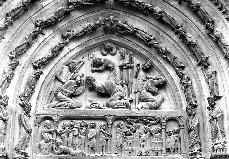 Extérieur, portail croisillon nord, tympan et archivoltes : Martyre de saint Denis et de ses compagnons