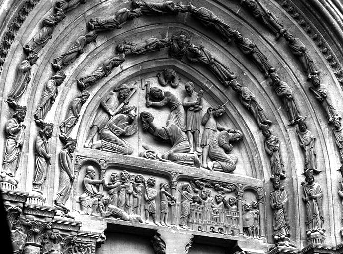 Extérieur, portail croisillon nord, tympan et archivoltes : Martyre de saint Denis et de ses compagnons