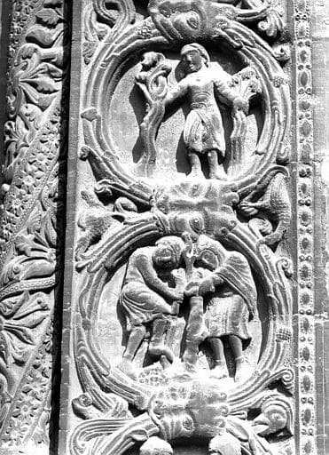 Extérieur, façade ouest, portail côté sud, encadrement senestre de la porte, Occupations des mois : Mars et Avril