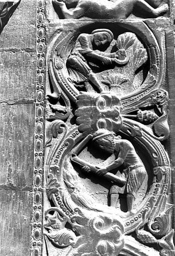 Extérieur, façade ouest, portail côté sud, encadrement dextre de la porte, Occupations des mois : Juillet et Août