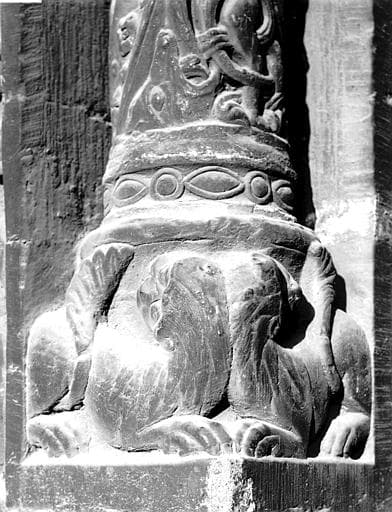 POP | Plateforme ouverte du patrimoineExtérieur, façade ouest, portail côté sud, encadrement dextre, base de la colonnette : lions ailés