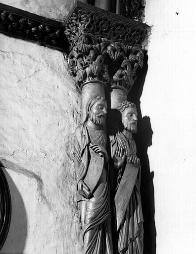 Ancienne chapelle de San-Miguel (détruite en octobre 1934), colonne jumelée, ornée d'un piédestal, portant deux statues d'apôtres et chapiteau historié : personnages à cheval combattant des lions, tailloir décoré d'entrelacs