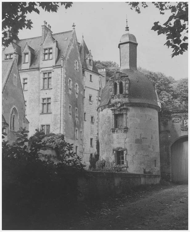 POP | Plateforme ouverte du patrimoineUne des tourelles encadrant la porte d'entrée. Vue d'ensemble depuis l'extérieur de l'enceinte. Pont