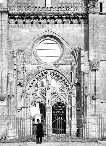 POP | Plateforme ouverte du patrimoineFaçade principale en ruine marquée 'Liberté Egalité Fraternité', homme en pose devant