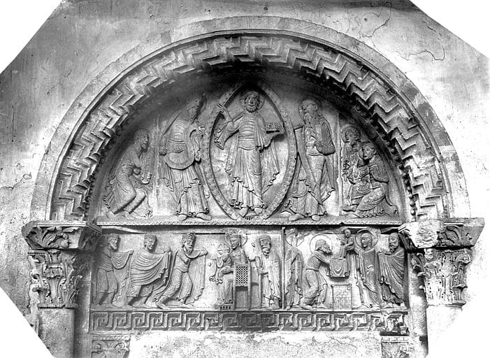 POP | Plateforme ouverte du patrimoinePortail du clocher, côté ouest. Tympan : Christ bénissant, Adoration des mages, Présentation au Temple