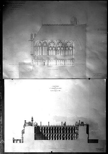 POP | Plateforme ouverte du patrimoineProjet de restauration : Coupe longitudinale de la Sainte-Chapelle, côté extérieur. Coupe longitudinale de l'aile nord, côté cour. Reproduction d'un projet de restauration