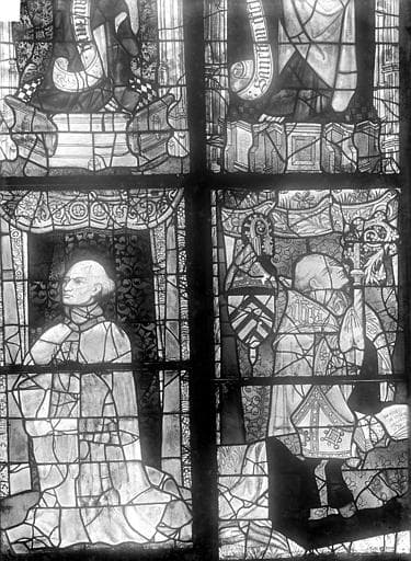 POP | Plateforme ouverte du patrimoineVitrail du transept nord, baie 13, panneaux 17 et 18 : Chanoine donateur et Adam Chastelain évêque du Mans