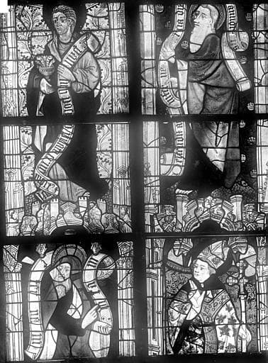 Vitrail du transept nord, baie 13, panneaux 5, 6, 13 et 14 : Saint Jean l'évangéliste, saint Thomas, saint Mathias et saint René (supposé) évêque d'Anjou
