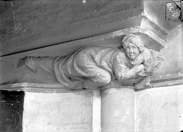 Vue intérieure de la salle des Pas-Perdus : Chapiteau de la cheminée