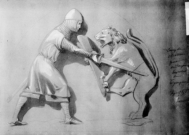 Dessin aquarellé : porte du donjon, tympan, chevalier se battant contre un lion