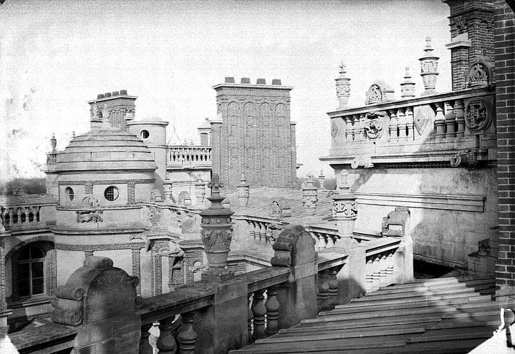 Balustrade, souches de cheminée et partie supérieure de la tourelle nord-est, côté cour