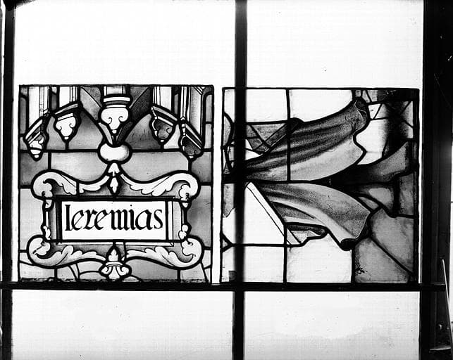 Deuxième galerie, portail sud, lancette de Jérémie, titulus et jambes