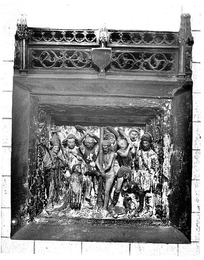 POP | Plateforme ouverte du patrimoineMonument des chanoines et des grands doyens, sans inscription. Haut-relief en pierre peinte : La Flagellation avec les donateurs et leurs saints patrons