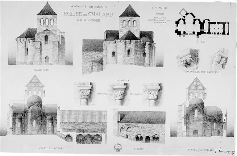 Elévations des façades nord et est, plan du choeur et d'une partie du cloître. Dessin des encorbellements extérieurs, des chapiteaux des absides. Coupes longitudinale et transversale ; Elévation du cloître (état actuel)