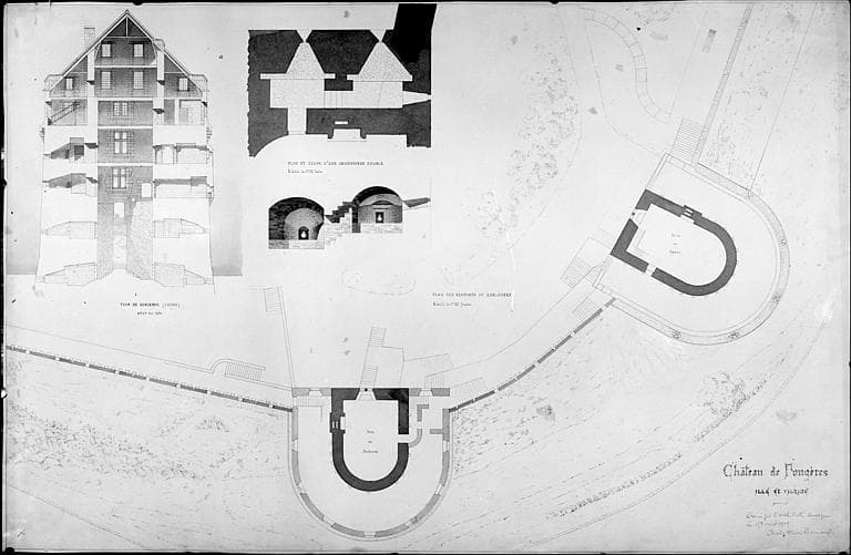 POP | Plateforme ouverte du patrimoineTour de Surienne : Coupe transversale. Plan et coupe d'une canonnière double. Plan des remparts au sud-ouest (état en 1904)