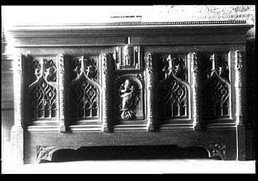 COFFRE ; ARCATURE ; BAS RELIEF ; ARC EN ACCOLADE ; ARC EN PLEIN CINTRE ; HAUT RELIEF ; FIGURATION DE LA VIERGE ; SERRURE ; ART GOTHIQUE