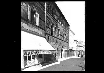 RUE ; PERSPECTIVE ; MAISON ; FACADE SUR RUE ; PORTE ; BAIE MUREE ; CORNICHE ; ETAGE ; FENETRE ; GEMINE ; ARC BRISE ; ART GOTHIQUE ; BOUTIQUE