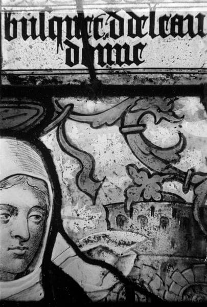 Sainte Barbe, saint Eustache et saint Jean-Baptiste, combat naval, panneau de vitrail, baie no 3, détail