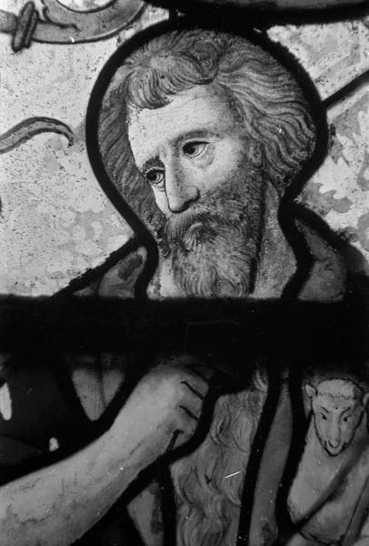 Sainte Barbe, saint Eustache et saint Jean-Baptiste, combat naval, panneau de vitrail, baie no 3, détail