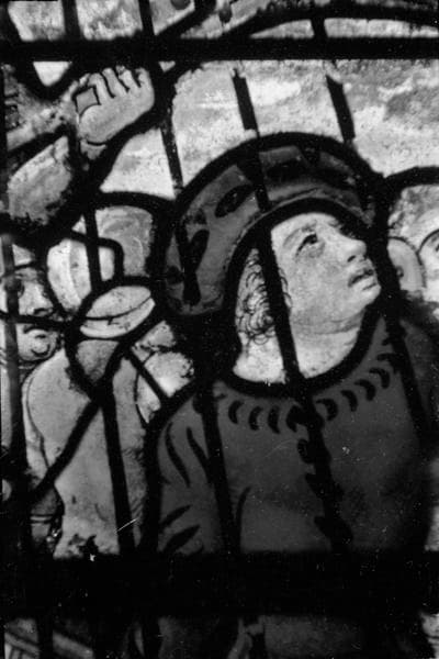 Sainte Barbe, saint Eustache et saint Jean-Baptiste, combat naval, panneau de vitrail, baie no 3, détail