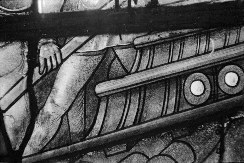 Sainte Barbe, saint Eustache et saint Jean-Baptiste, combat naval, panneau de vitrail, baie no 3, détail
