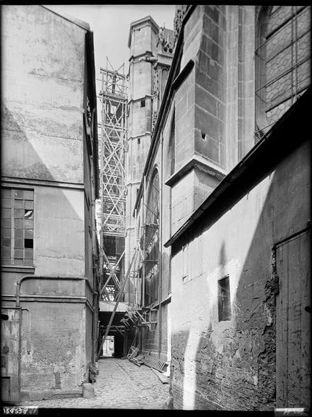 Extérieur de la façade sud, échafaudages de dépose des vitraux des fenêtres hautes