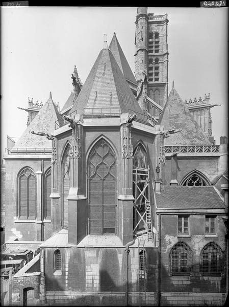 Extérieur de l'abside, échafaudages de dépose des vitraux des fenêtres hautes