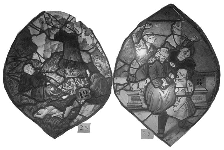 Mont des Oliviers et Christ aux outrages, panneau de vitrail. Mont des Oliviers et Christ aux outrages, panneau de vitrail