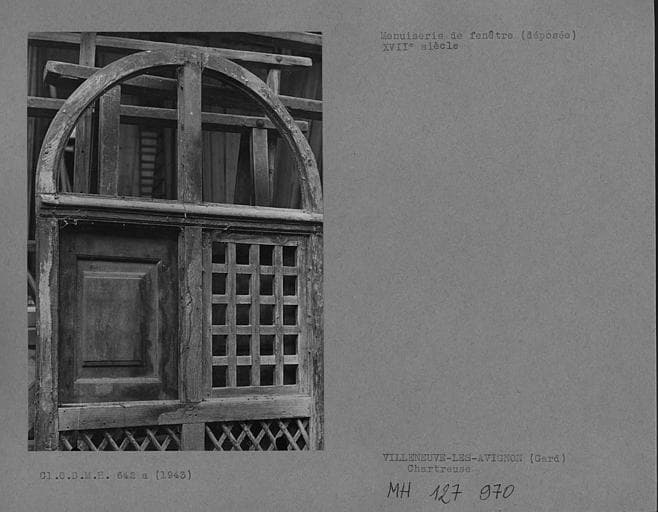 Menuiserie de fenêtre déposée, côté intérieur, registre central et partie supérieure