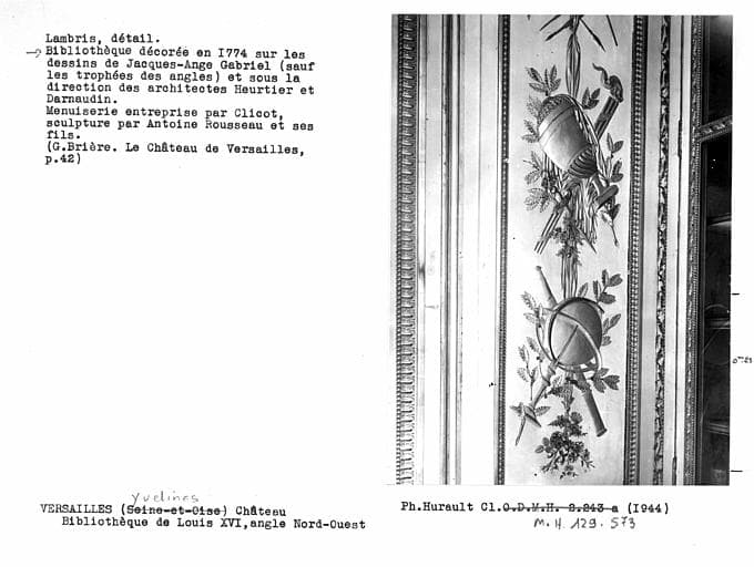 POP | Plateforme ouverte du patrimoineLambris de la bibliothèque de Louis XVI, angle sud-ouest, détail de boiserie, trophée