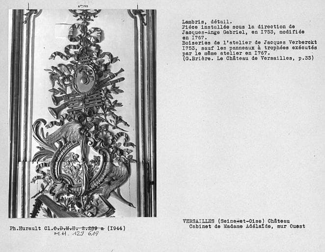 Décor du salon de Madame Adélaïde, lambris, détail du trophée du mur ouest