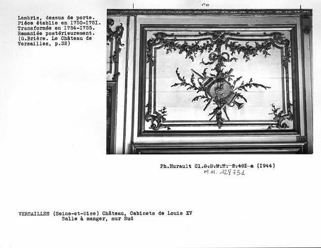 Décor de la salle-à-manger de Louis XV, lambris, motif de boiserie au-dessus de la porte de droite, mur sud